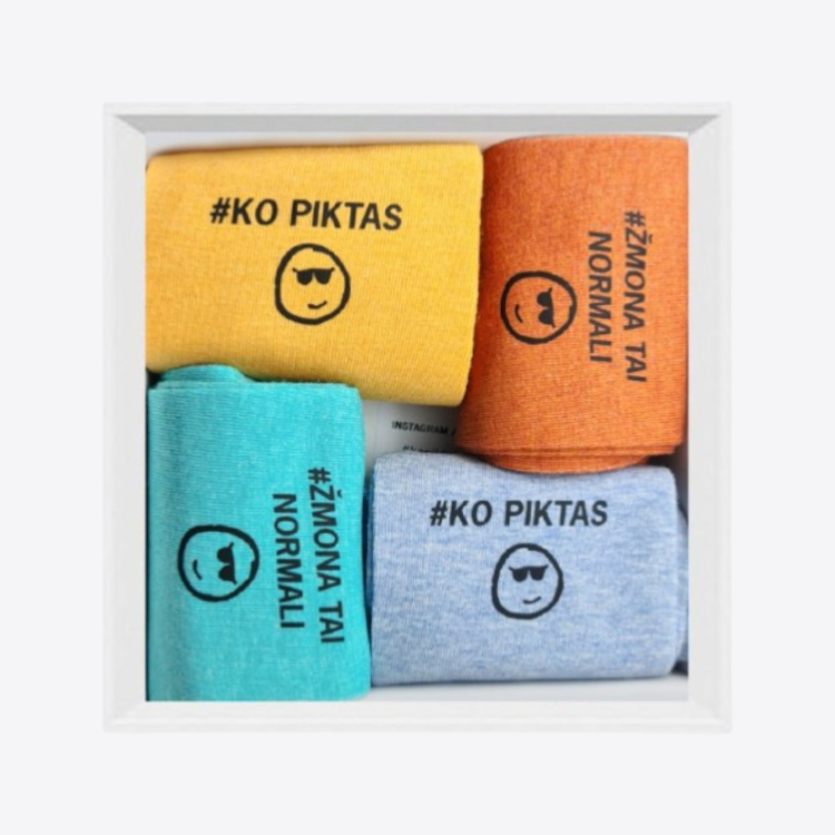 Pakuotėje 4 poros matomų ryškių spalvų kojinių su užrašu #KO PIKTAS #ŽMONA TAI NORMALI.