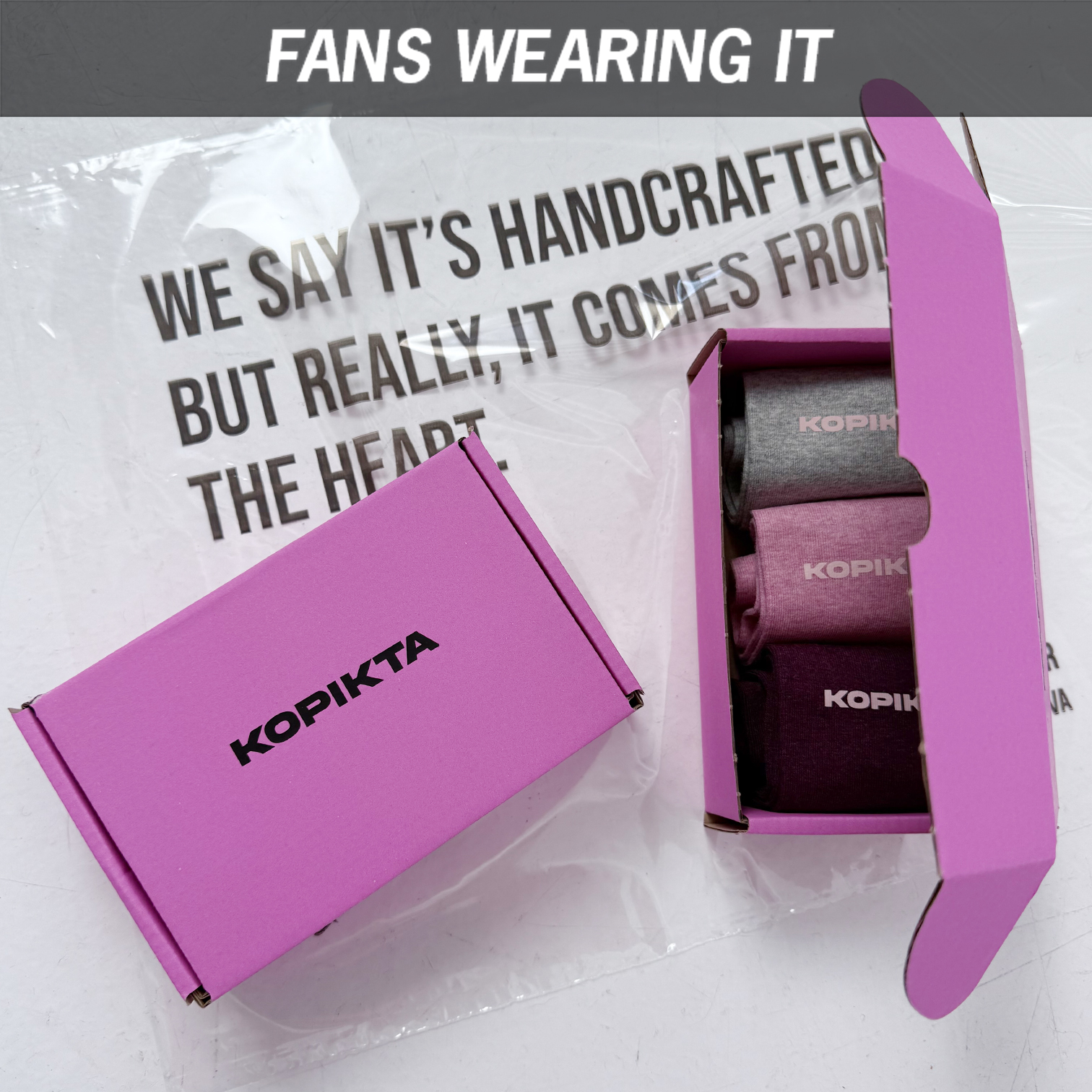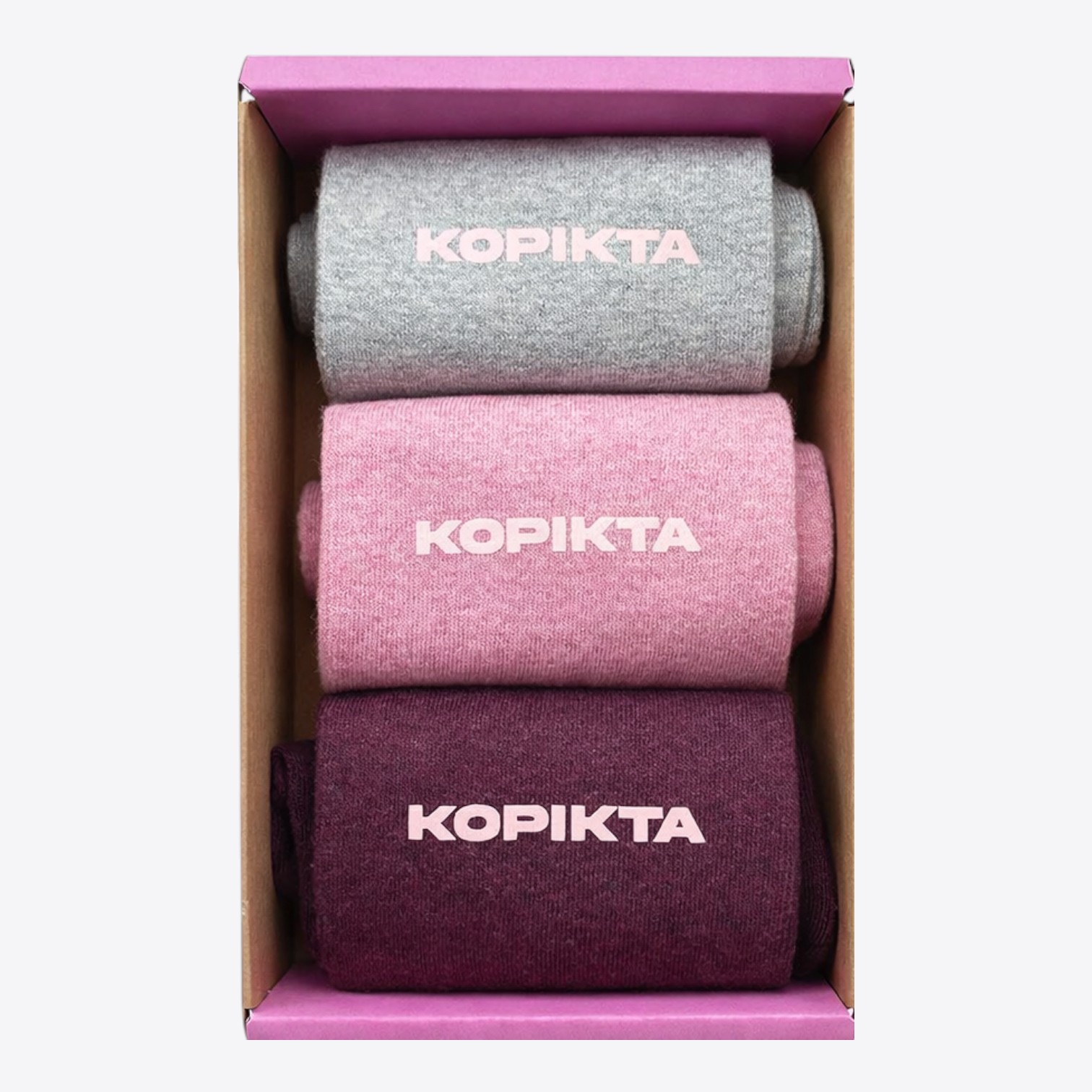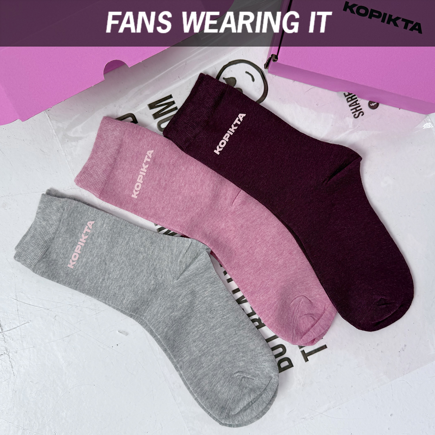 Pakuotėje 3 poros matomų spalvų kojinių su šypseną keliančia KOPIKTA.